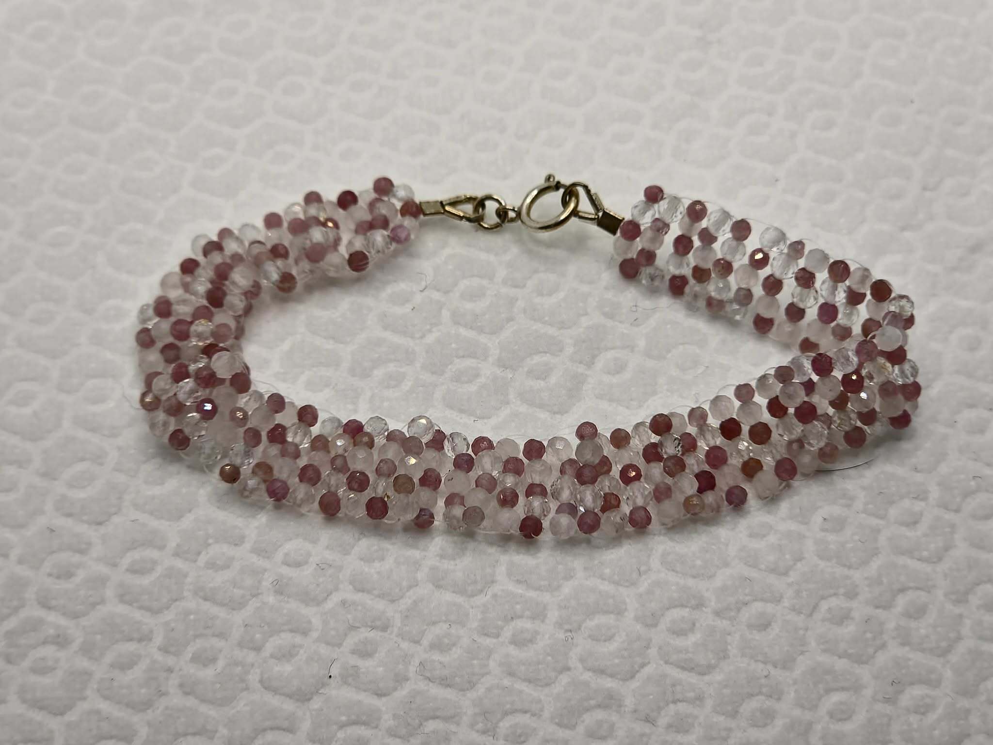 Ręcznie szyta bransoletka z naturalnych turmalinów różowych i rubinowych, kryształu górskiego oraz kwarcu różowego. Subtelna, kobieca i pełna naturalnego blasku.